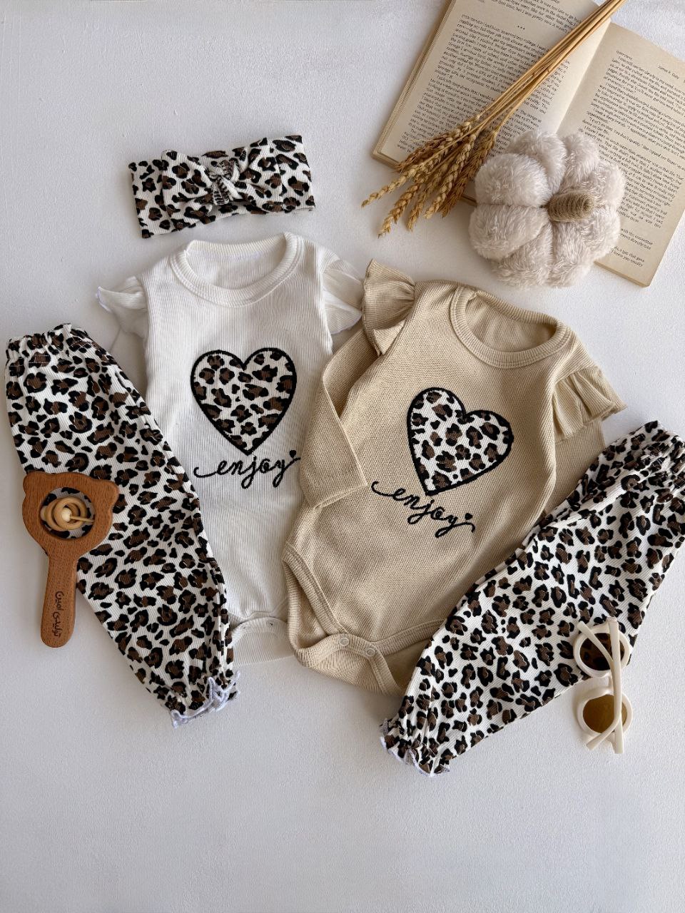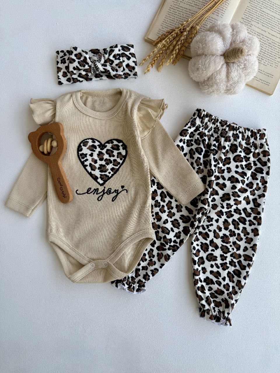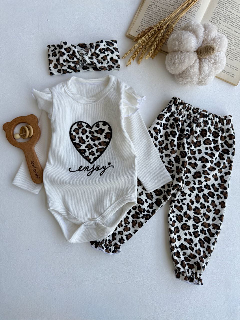 ست سه تکه بادی شلوار قلبی پلنگی از 3 تا 24 ماه با هد