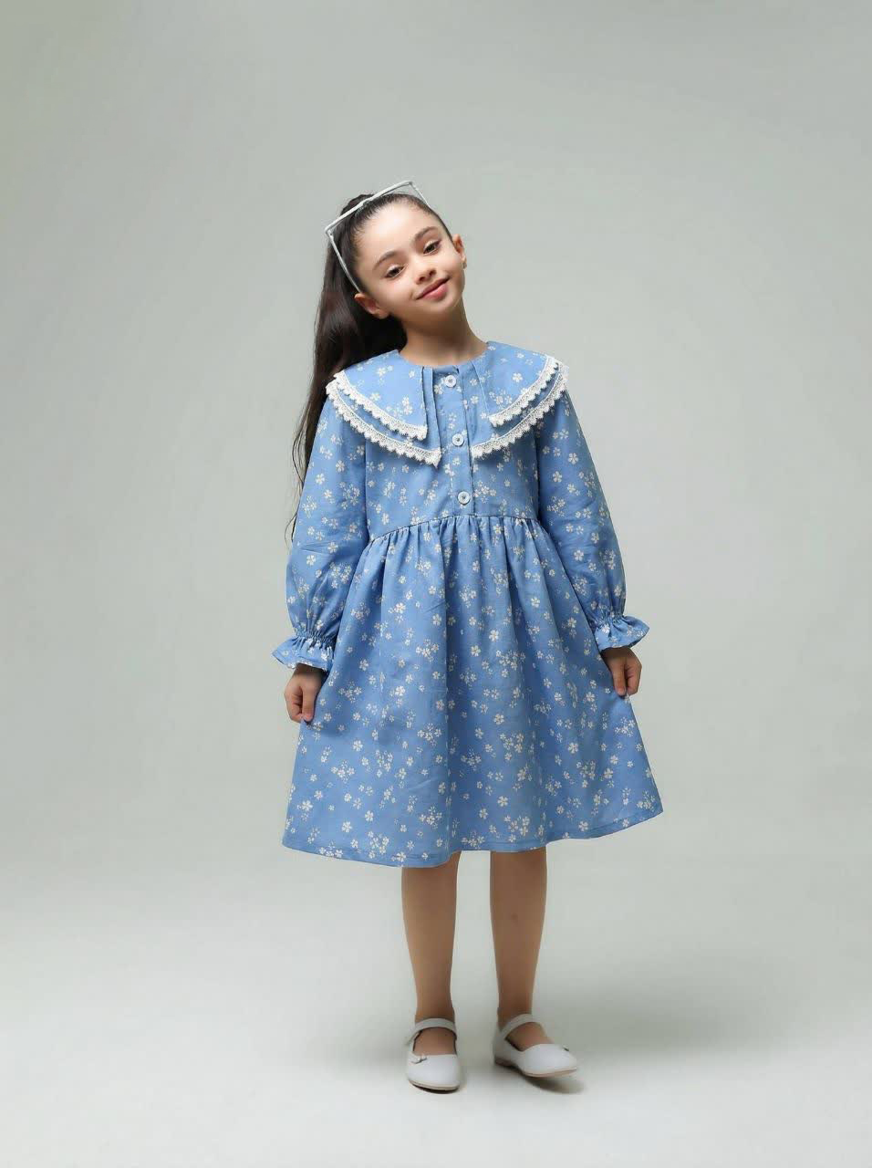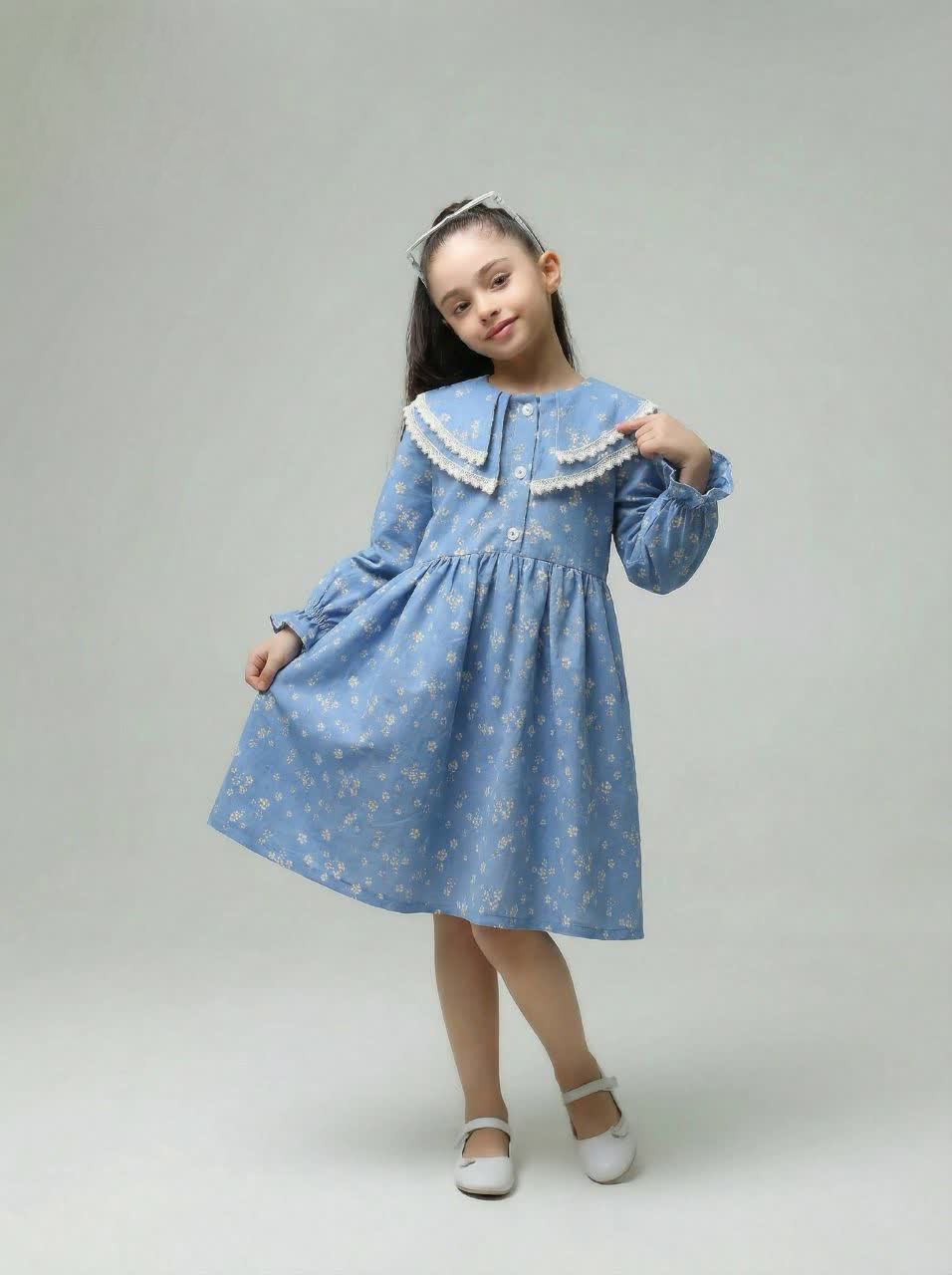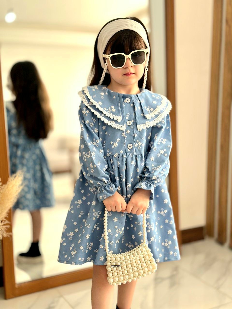 جنس: جین کاغذی گل برجسته با یقه گیپوردار