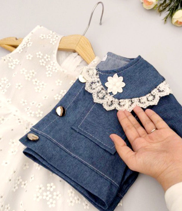 کت جین شست شده گرم بالا و سارافون تور دانتل همراه با دو آستر