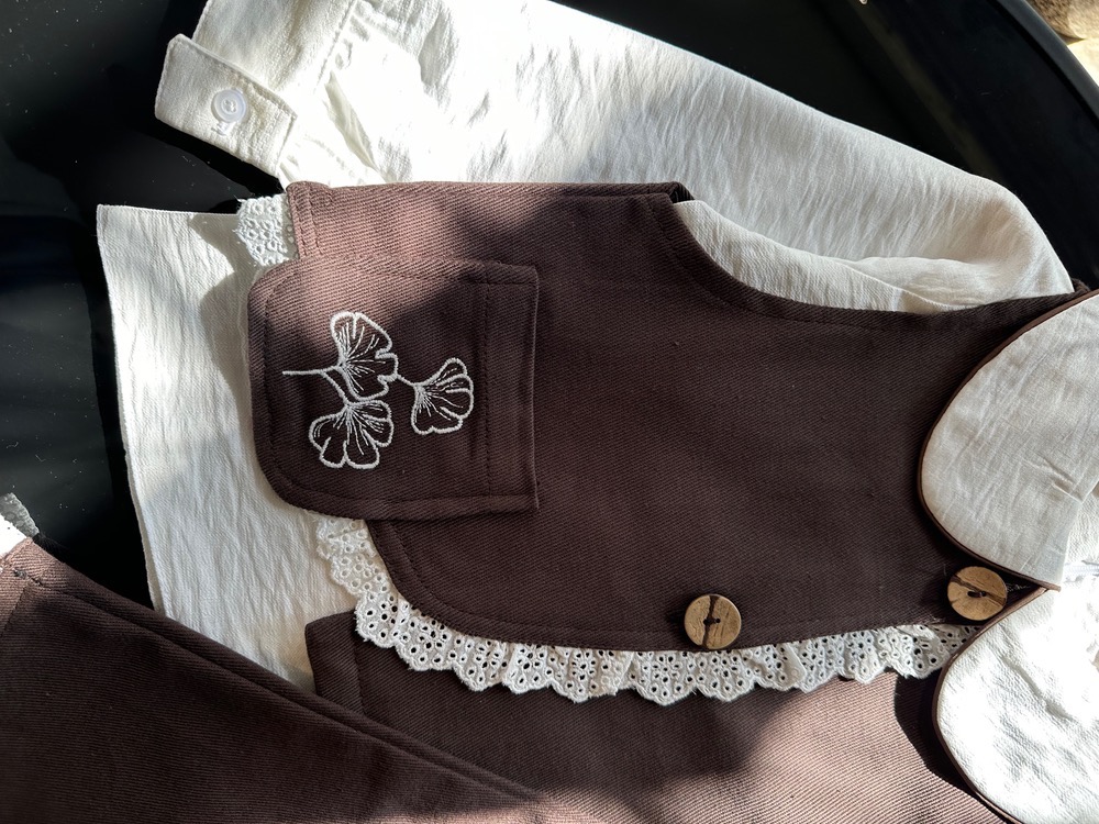 ژیله نواردوزی گیپور دارد و روی جیب گلدوزی شده، پشت کمری شلوار کش خورده